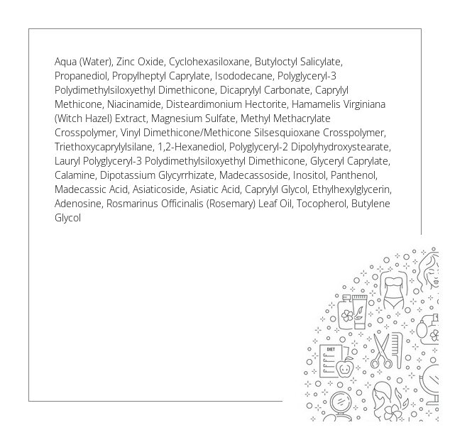 Krem przeciwsłoneczny do twarzy skomponowany z wyselekcjonowanych naturalnych składników posiada szerokie spektrum ochrony SPF50+ PA++++. Certyfikowany przez organizację badań klinicznych, zapewnia skórze skuteczną ochronę i bezpieczeństwo przed promieniowaniem UVA i UVB. Receptura wzbogacona o pantenol i niacynamid dobroczynnie wpływa na łagodzenie podrażnień oraz wspomaga procesy naprawcze skóry. Wykazuje właściwości przeciwzapalne, kojące i nawilżające, dzięki zawartości kwasu azjatykowego i madekasowego, które pozyskiwane są z rośliny leczniczej zwanej wąkrotą azjatycką. Ekstrakt z oczaru wirginijskiego rozjaśnia przebarwienia, jak i również pomaga cerze problematycznej przywrócić jej komfort. Krem posiada lekką konsystencję, dobrze się wchłania, nie obciąża skóry oraz nie pozostawia białych śladów. Przeznaczony do codziennej pielęgnacji, po zastosowaniu efekt odświeżenia za sprawą zawartości olejku z liści rozmarynu