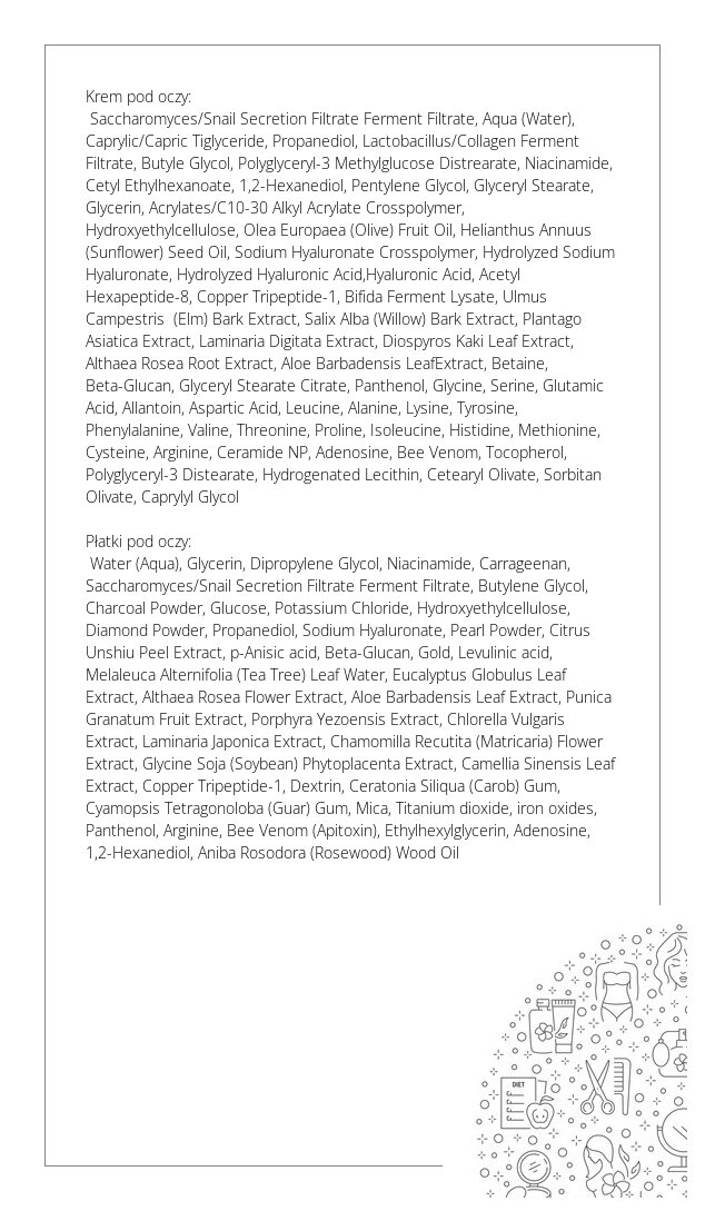 Hydrożelowe płatki pod oczy Snali Bee Ultimate Hydrogel Eye Patch mają bardzo bogaty skład, dzięki czemu skutecznie pielęgnują skórę wokół oczu i nadają spojrzeniu blasku. Płatki zawierają wyciąg ze śluzu ślimaka, jad pszczeli, złoto oraz ekstrakt z wodorostów. Filtrat ze śluzu ślimaka wygładza skórę pod oczami oraz intensywnie ją odżywia i nawilża. Złoto natomiast wspomaga utrzymanie odpowiedniego poziomu nawilżenia oraz poprawia koloryt i rozświetla skórę. Jad pszczeli zwiększa produkcję kolagenu i elastyny, co działa przeciwzmarszczkowo. Przynosi szybki efekt odżywienia i elastyczności. Wyciąg z liści wodorostów to źródło przeciwutleniaczy, witamin i minerałów. Dzięki temu poprawia krążenie i zmniejsza cienie oraz obrzęki. Bogactwo składników odżywczych skutecznie regeneruje i nawilża skórę pod oczami. Należy pamiętać o dokładnym zamknięciu opakowania, aby zapobiec wysuszeniu płatków.